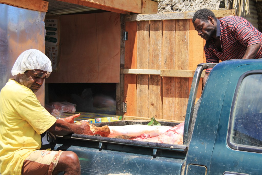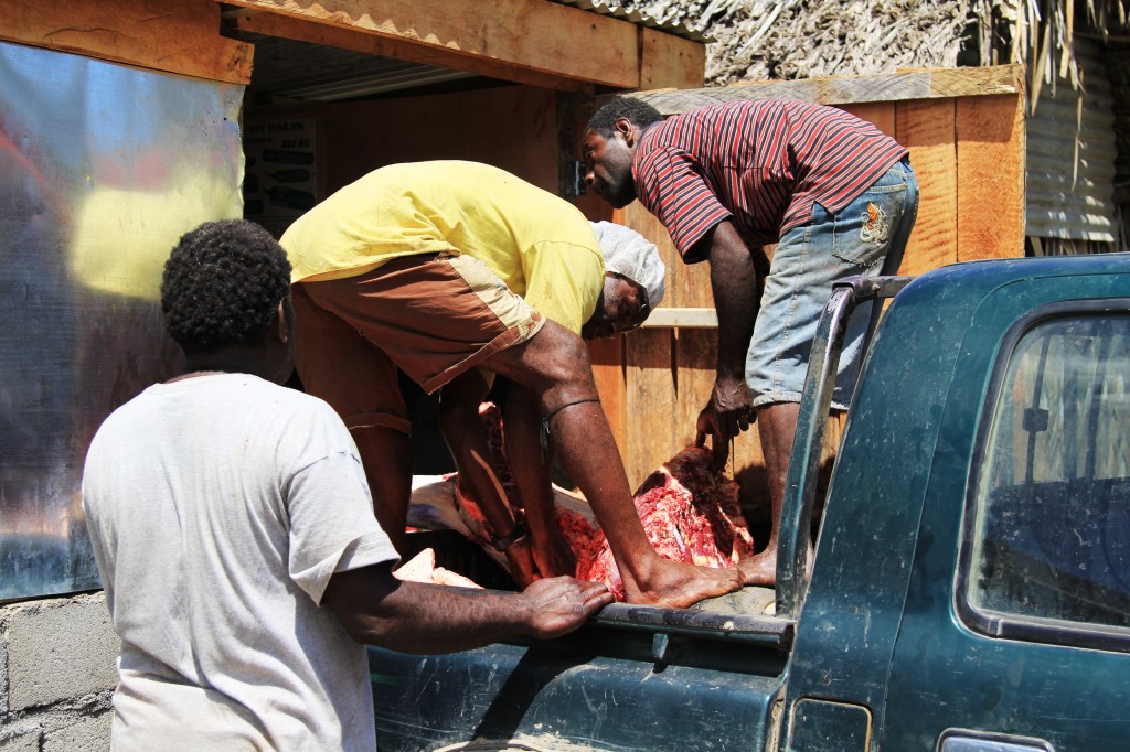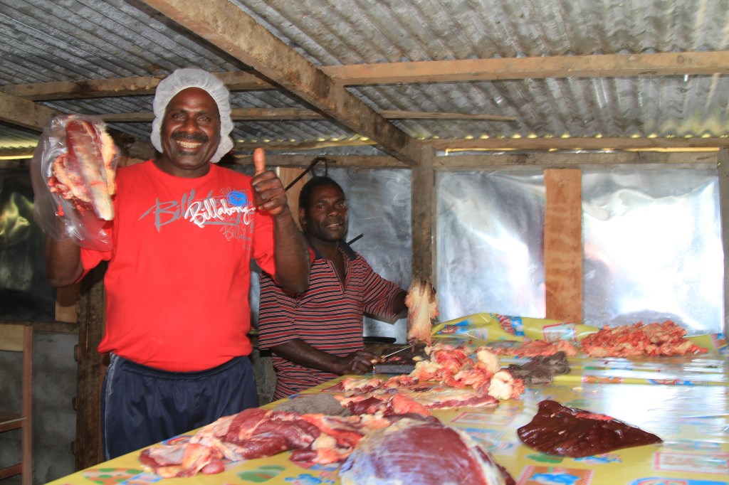 A couple of barefoot guys started hauling a skinned & gutted carcass out of the open top ute and another dragged it over the butcher’s counter.