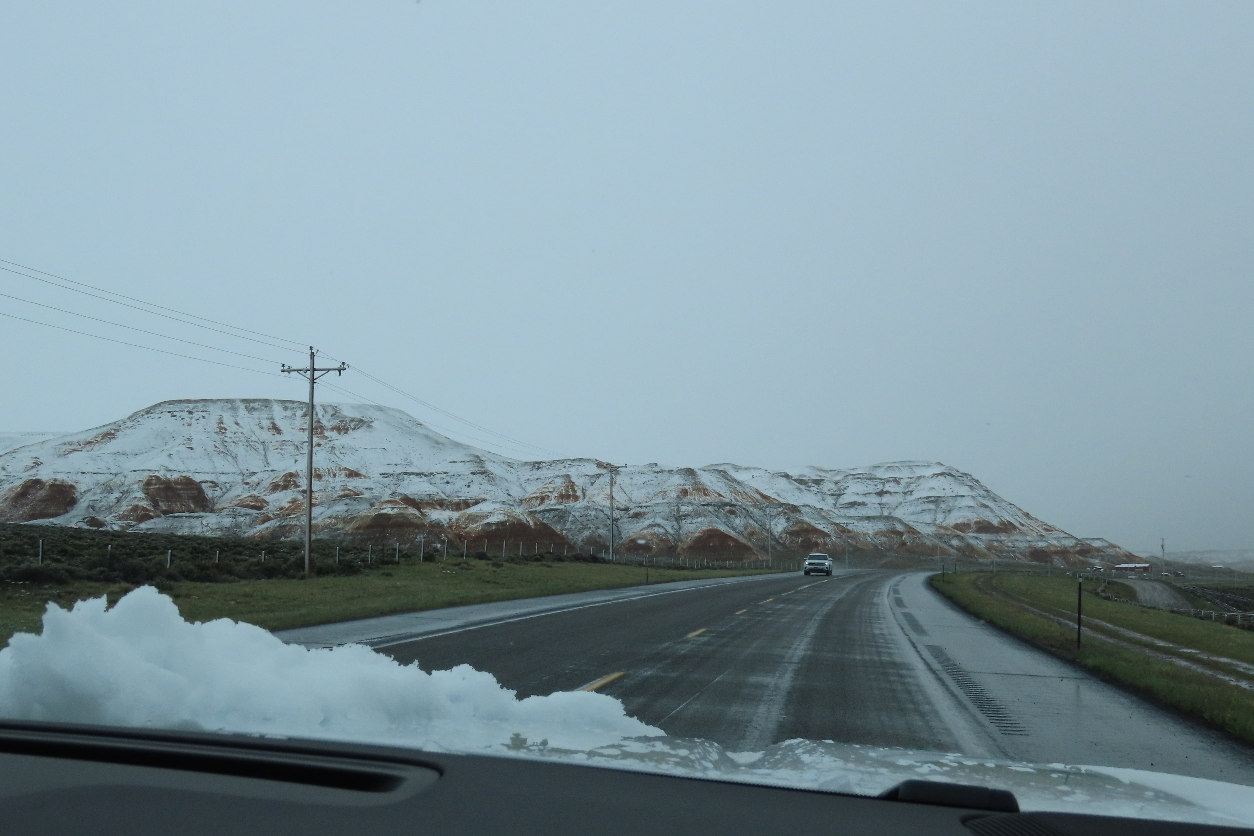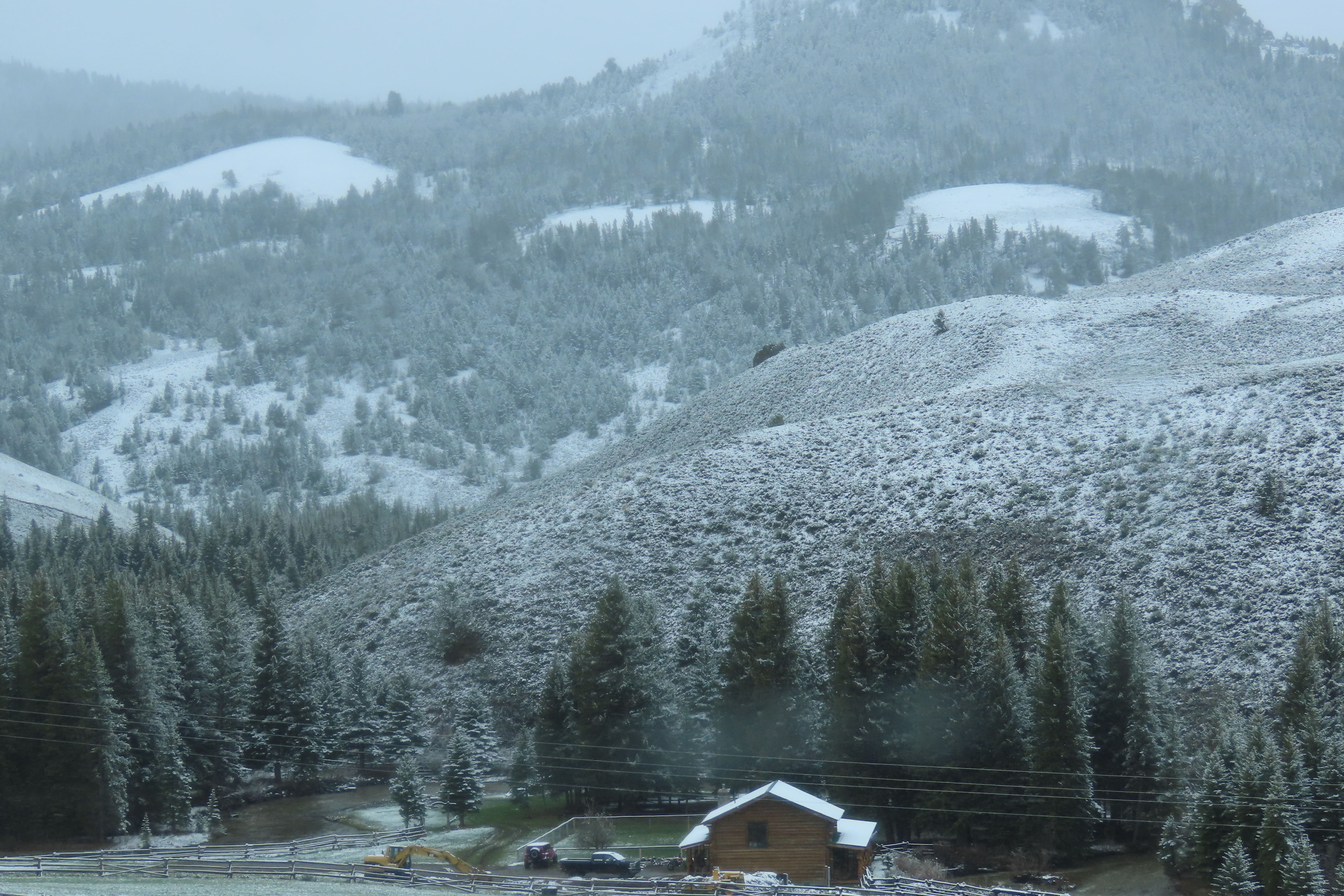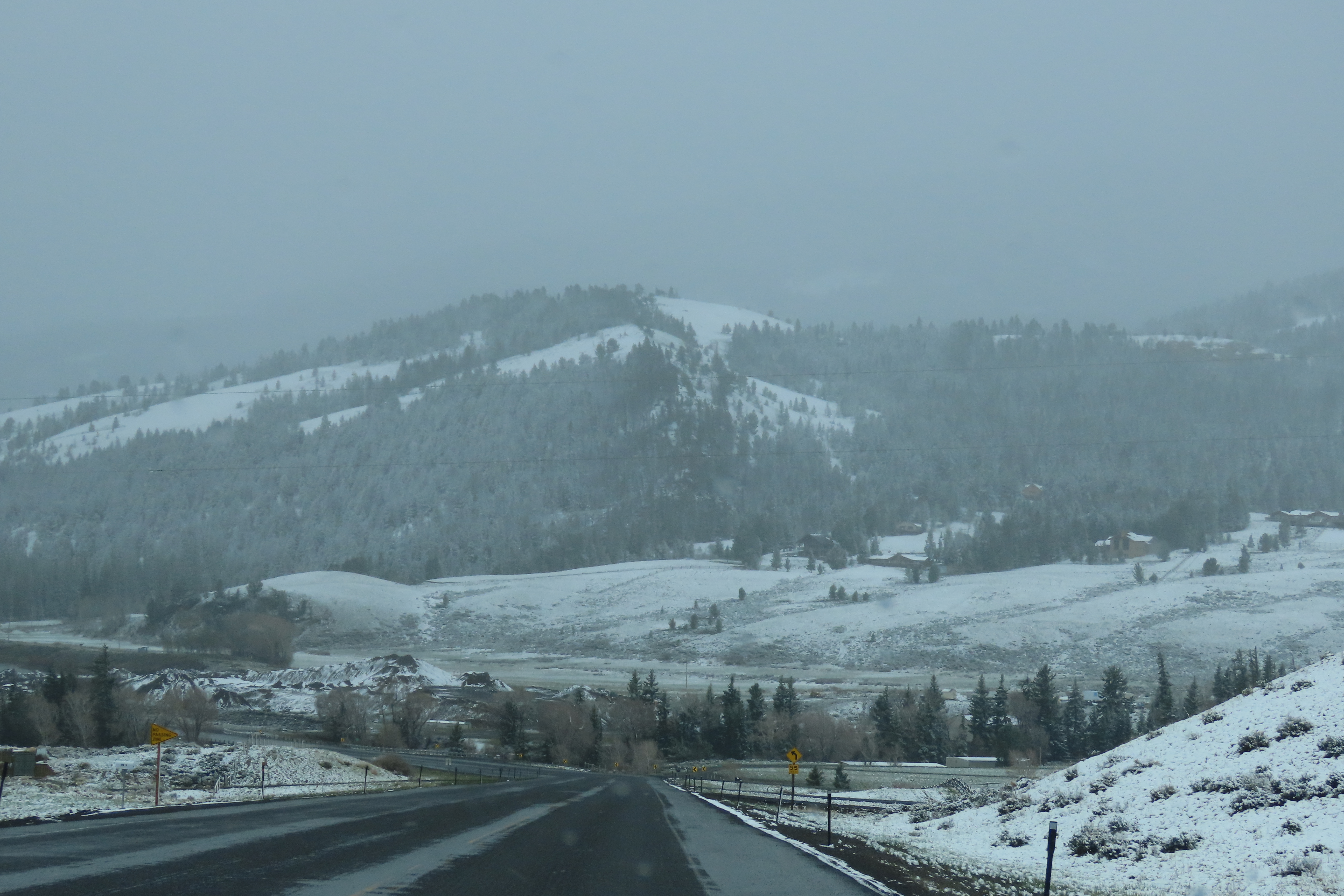 We woke to a very snowy morning, so much so that the shortcut we were going to take through Yellowstone was closed so we had to make a 200km detour and over an 11,000 foot pass with ice & snow over the road. Having never driven in conditions remotely like these, Brian’s knuckles were white for most of that part of the journey.
