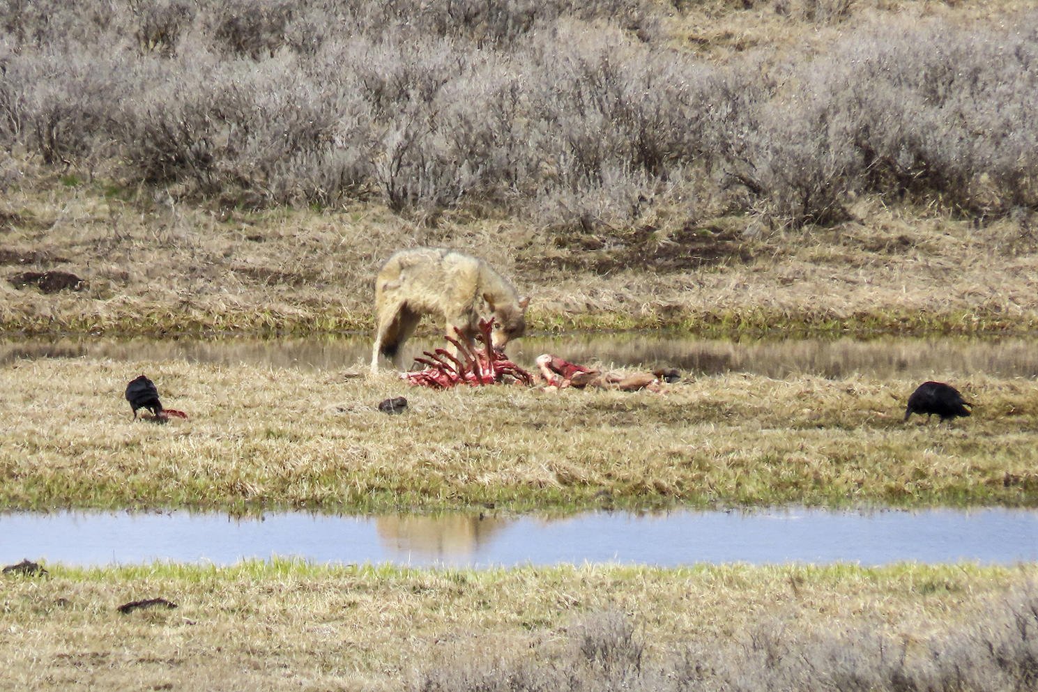 Our early venture out into the park treated us to a site rarely seen; a wolf feasting on the remains of what most believed to be an elk carcass. He may have been the star of the show but he wasn’t the only game in town that day and of course the views aren’t bad either!