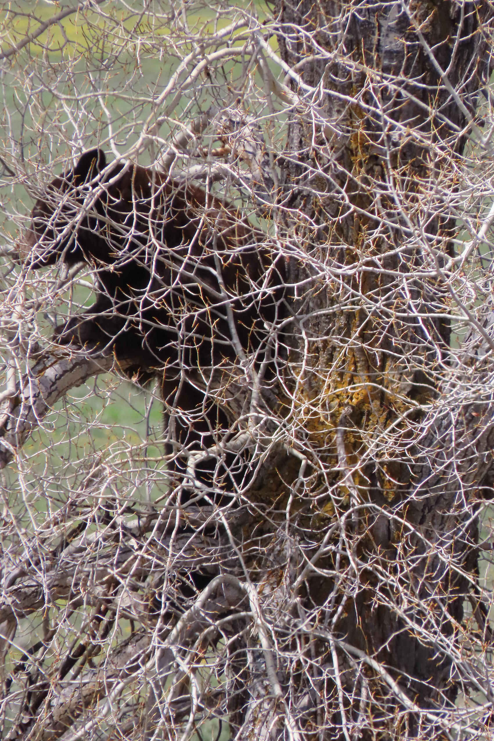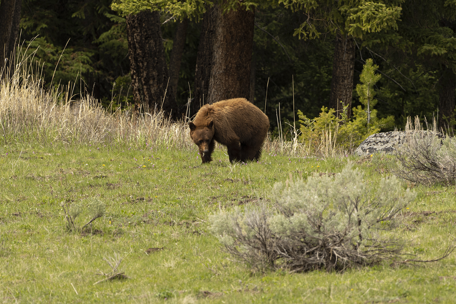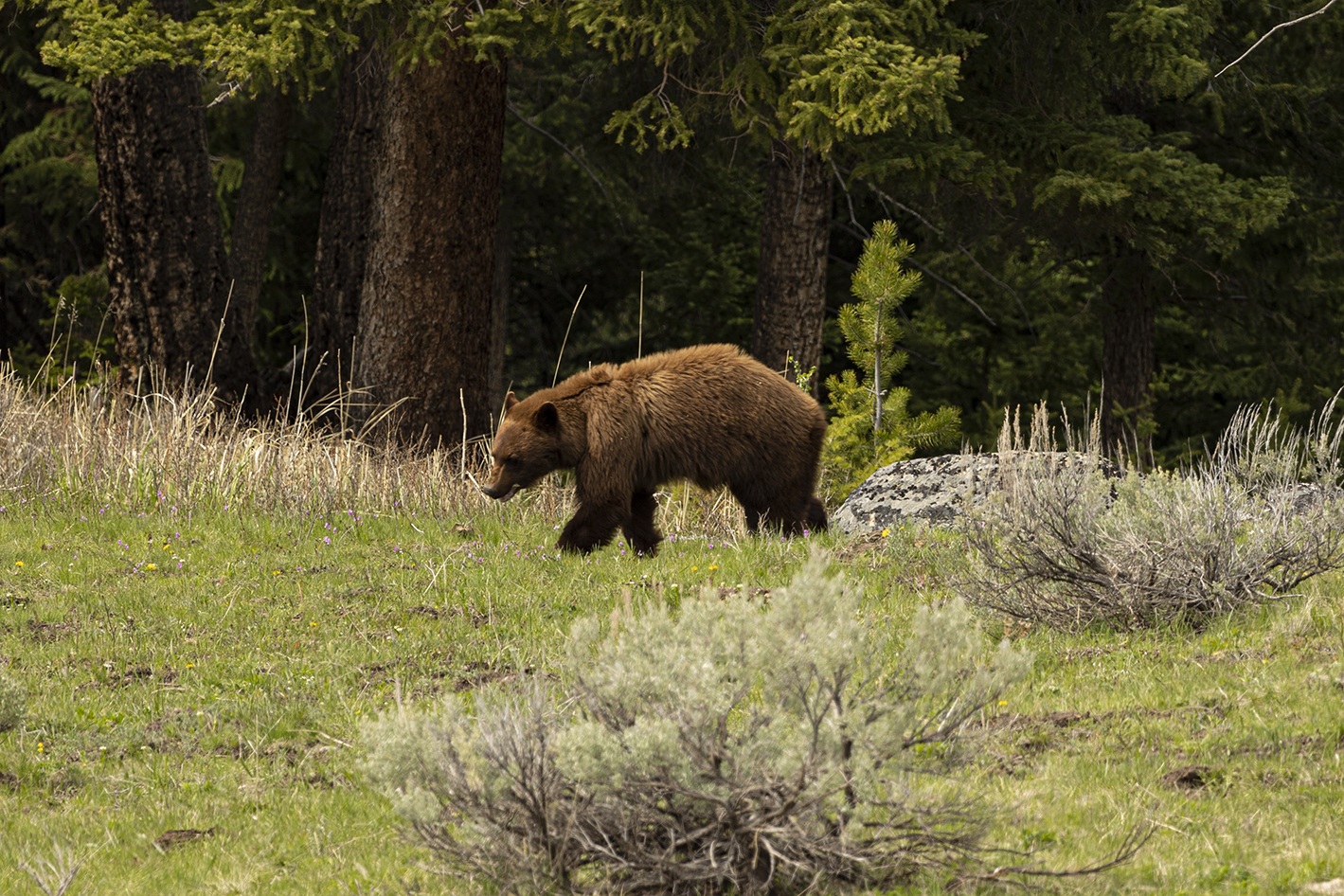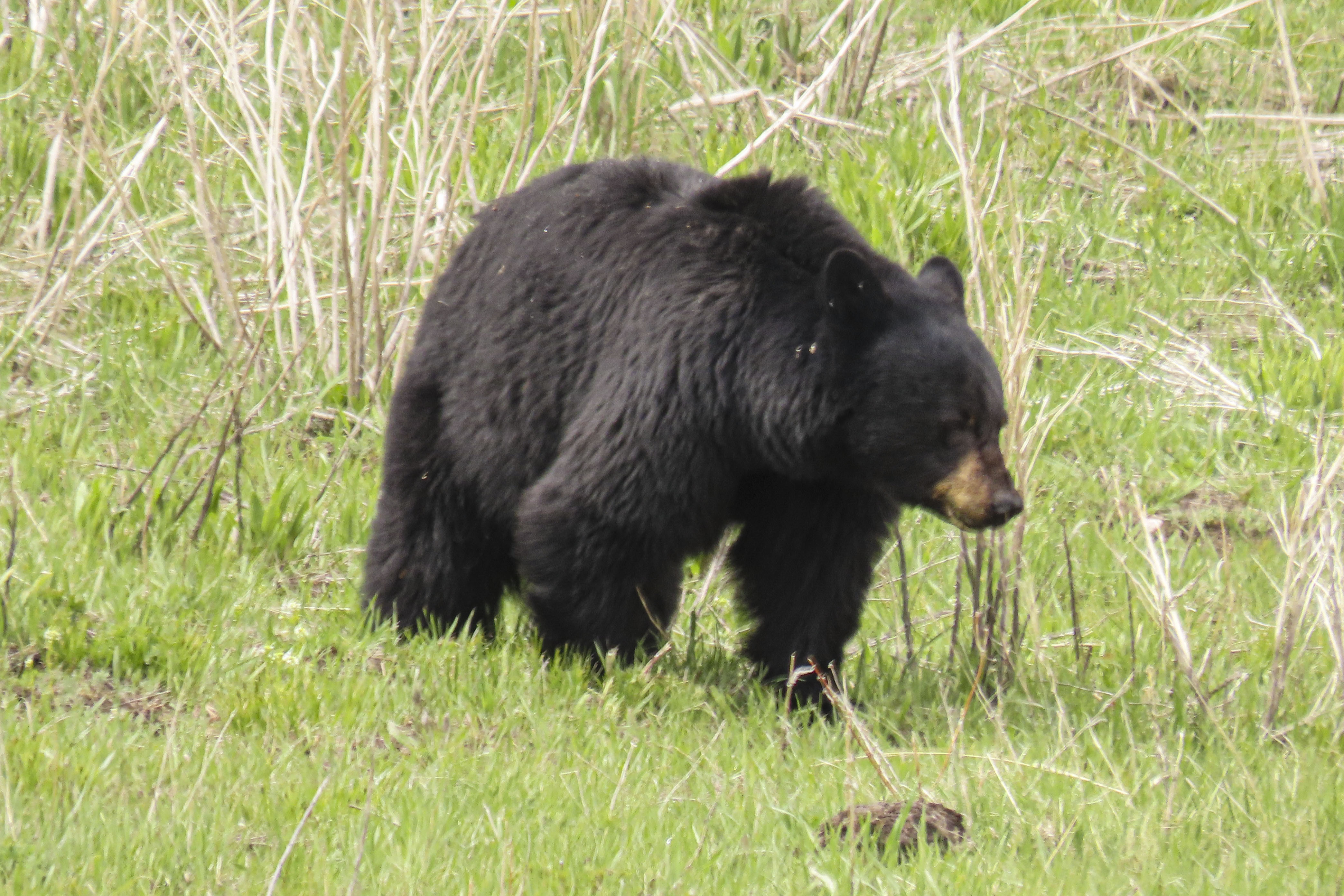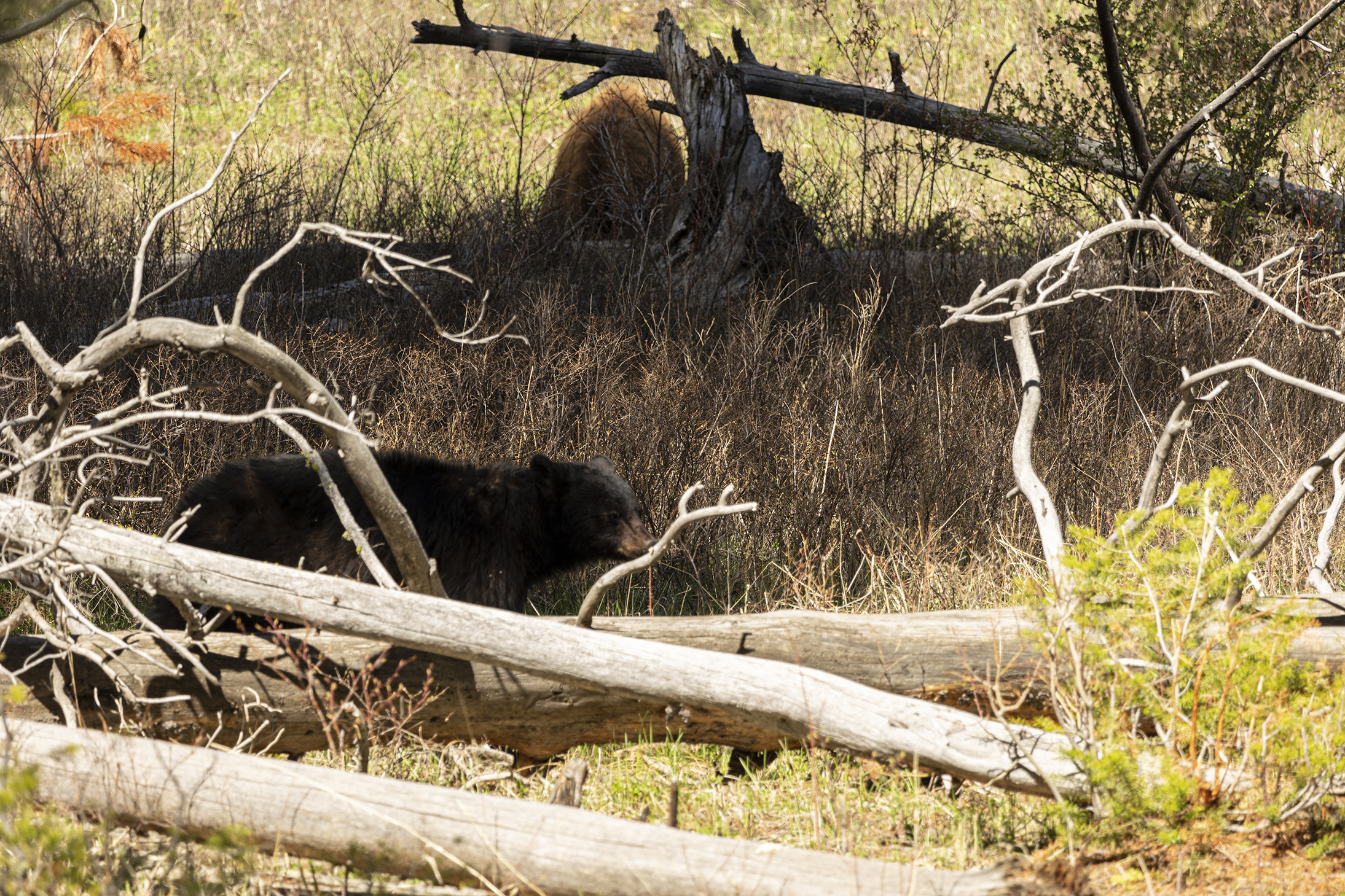 On the way through the Lamar Valley all traffic was stopped a a black bear had gotten itself up a tree on the roadside and would not come down while traffic & people were around. Rangers kept cars well back from the tree till they could coax it down & let it move on. Decided to give Tower another go as it has been so successful previously & we were lucky to see a black bear & a cinnamon bear grazing.