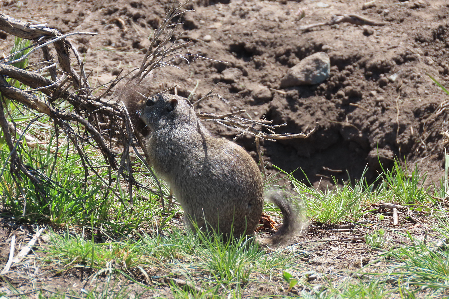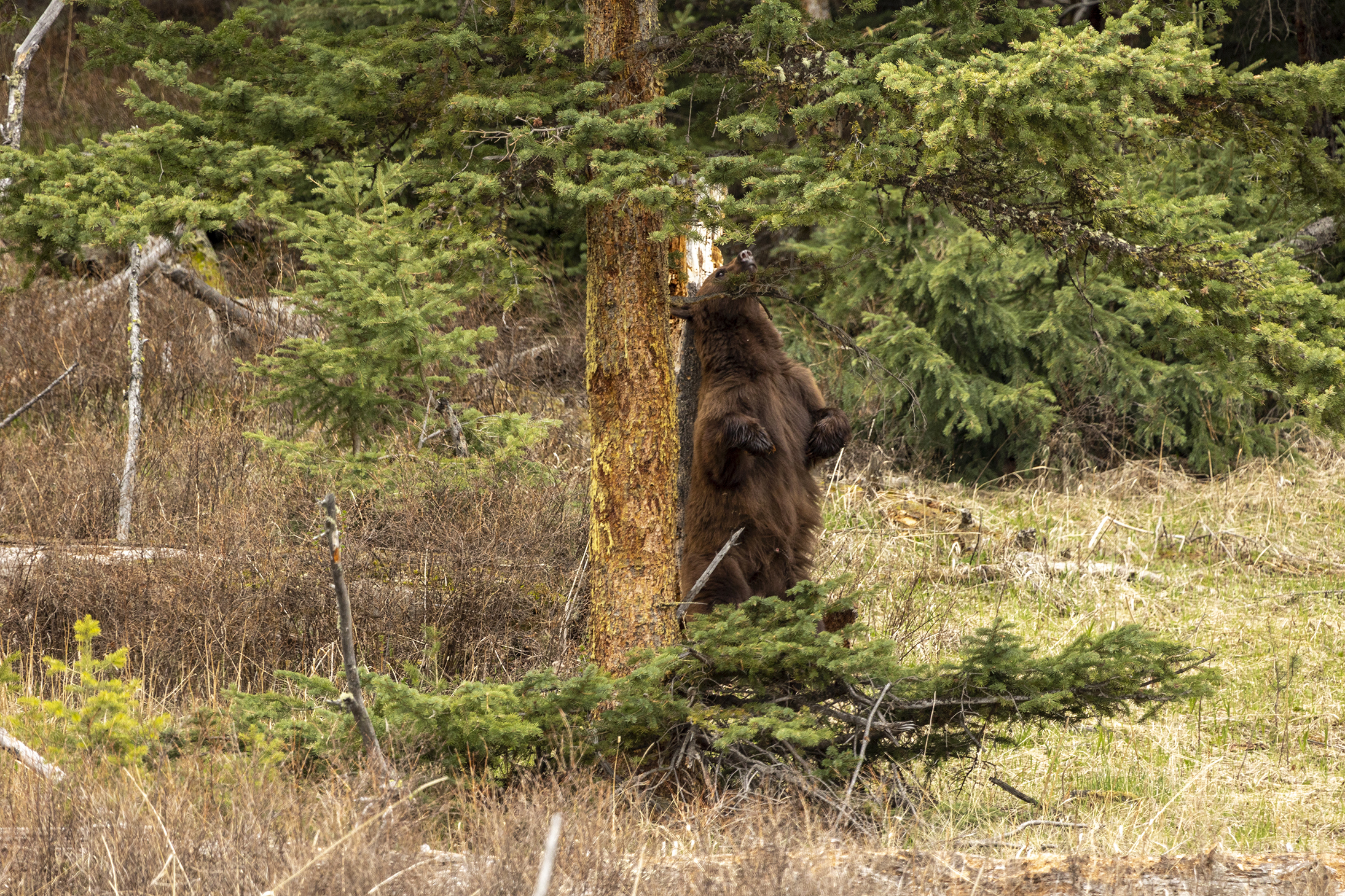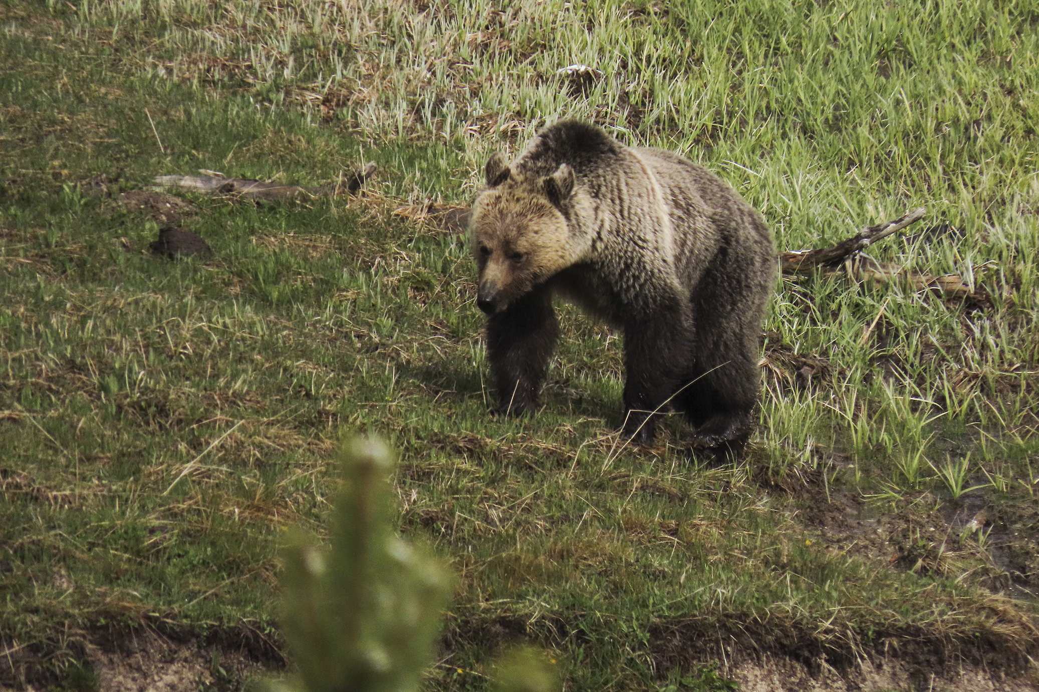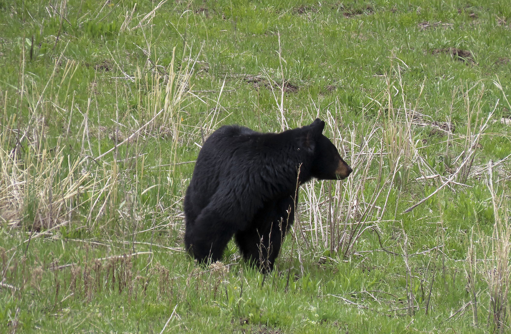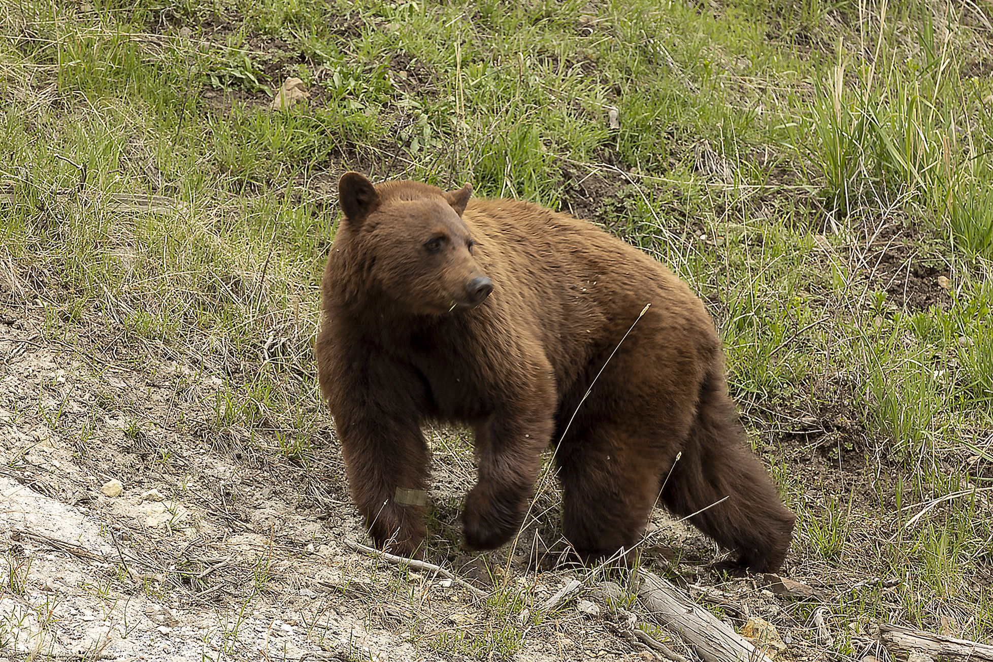 On the way through the Lamar Valley all traffic was stopped a a black bear had gotten itself up a tree on the roadside and would not come down while traffic & people were around. Rangers kept cars well back from the tree till they could coax it down & let it move on. Decided to give Tower another go as it has been so successful previously & we were lucky to see a black bear & a cinnamon bear grazing.