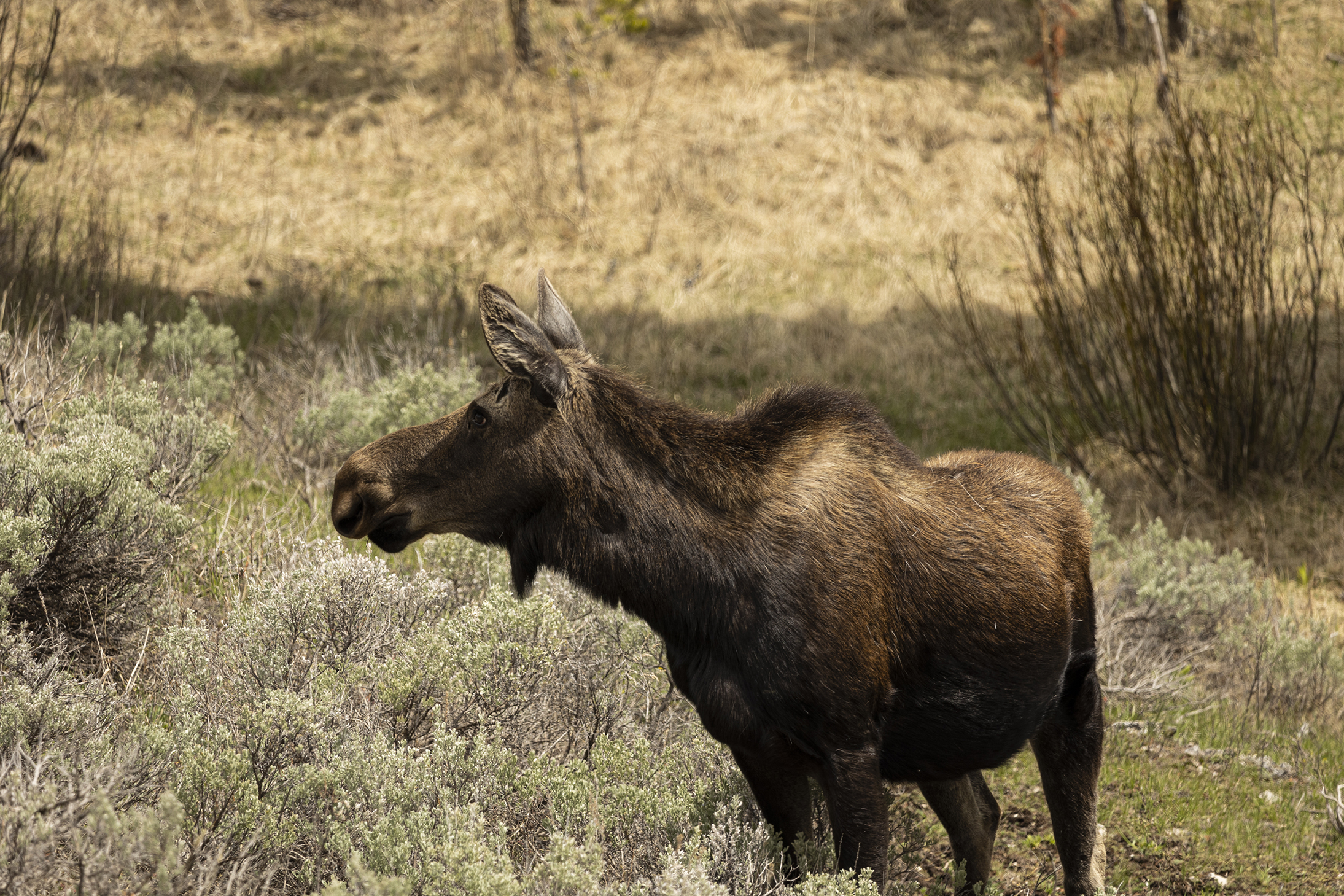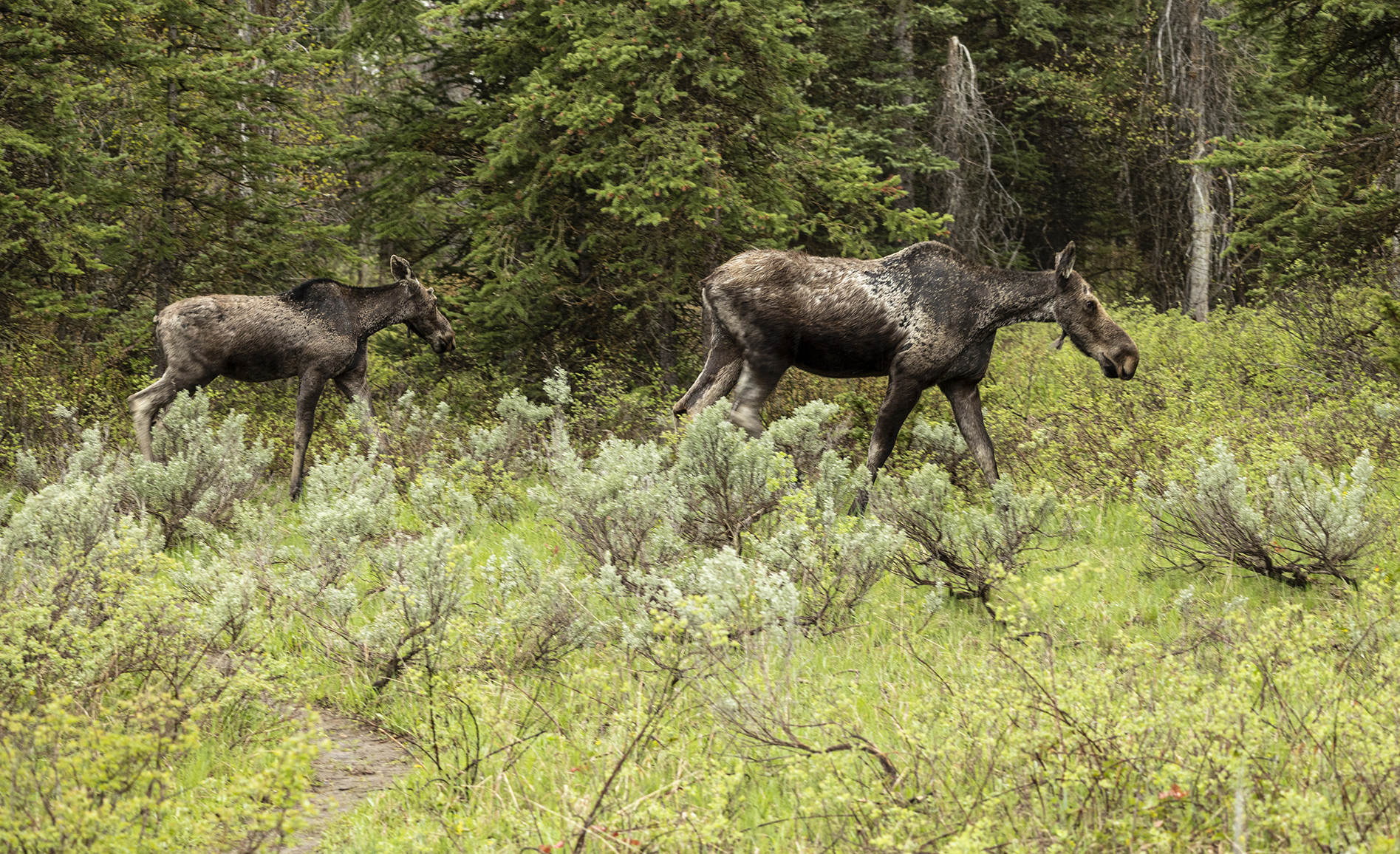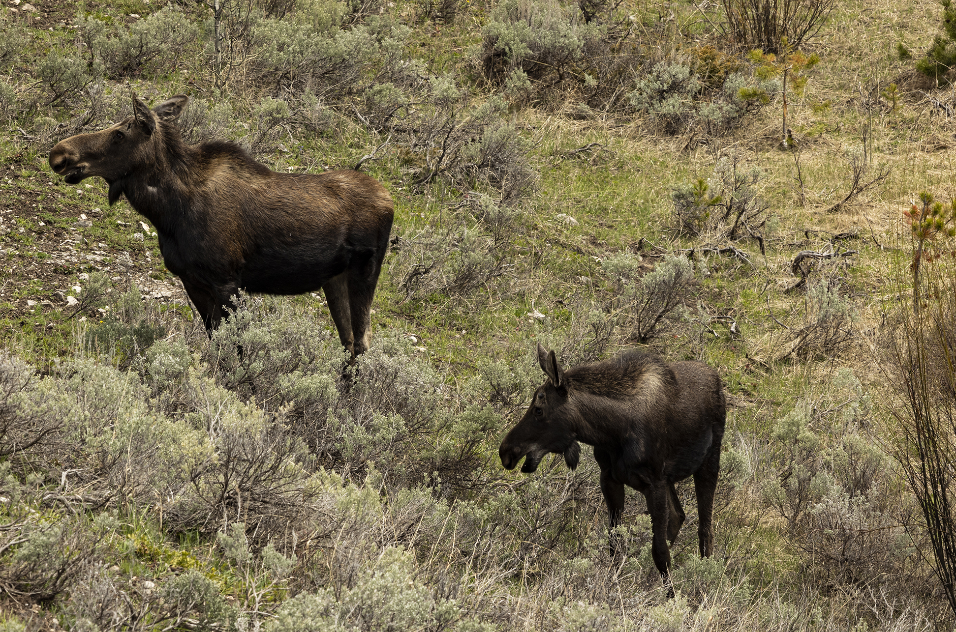 Drove out of the park to Cooke City for lunch and after about 5 minutes inside the park came across a female moose with her calf.
