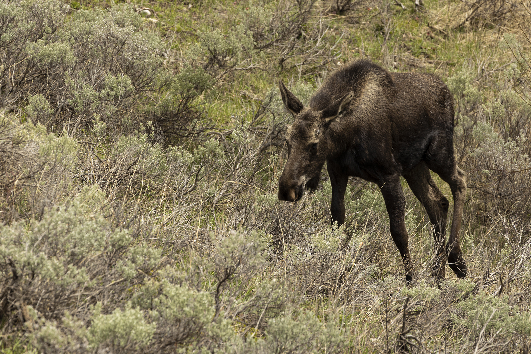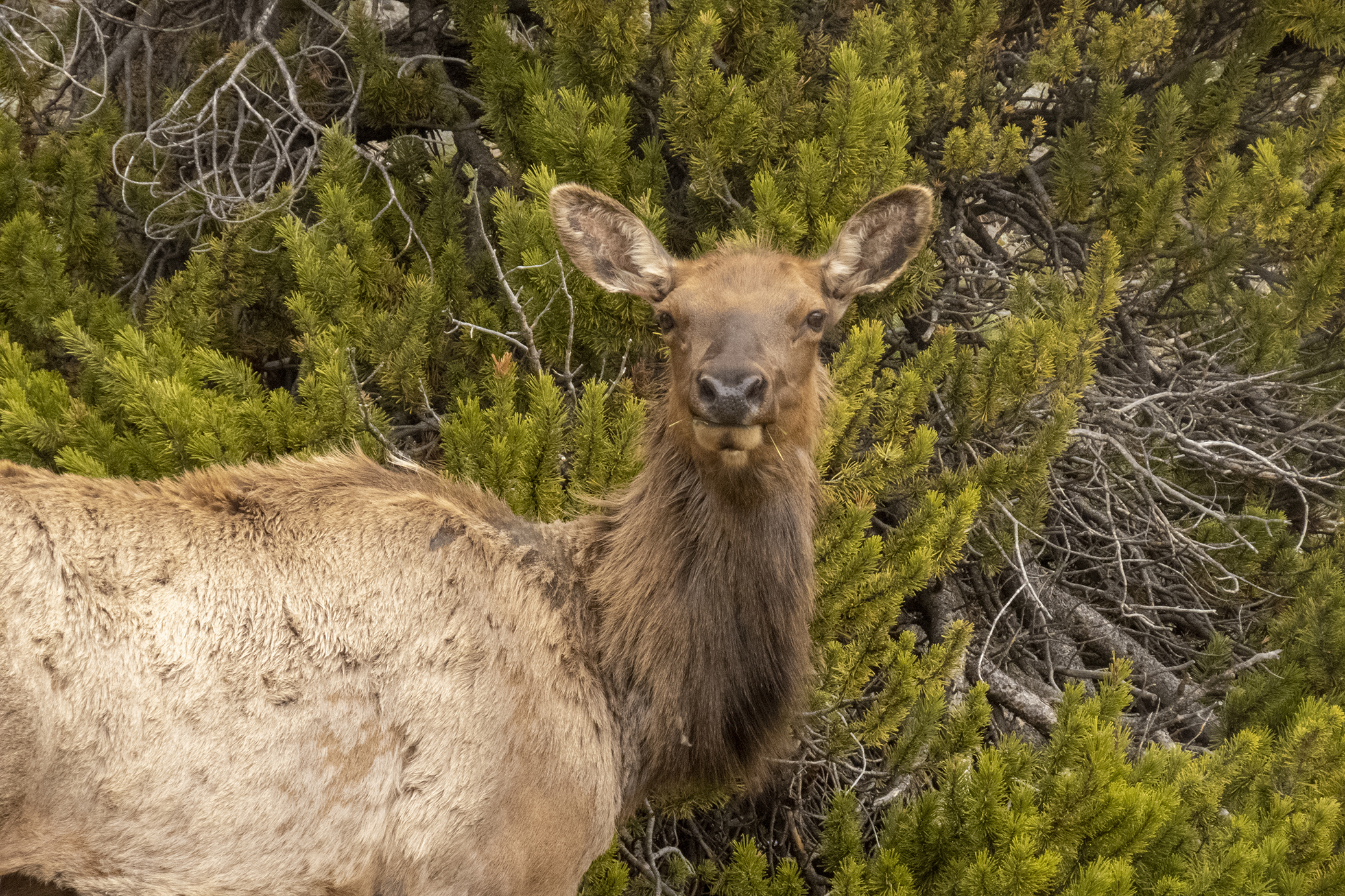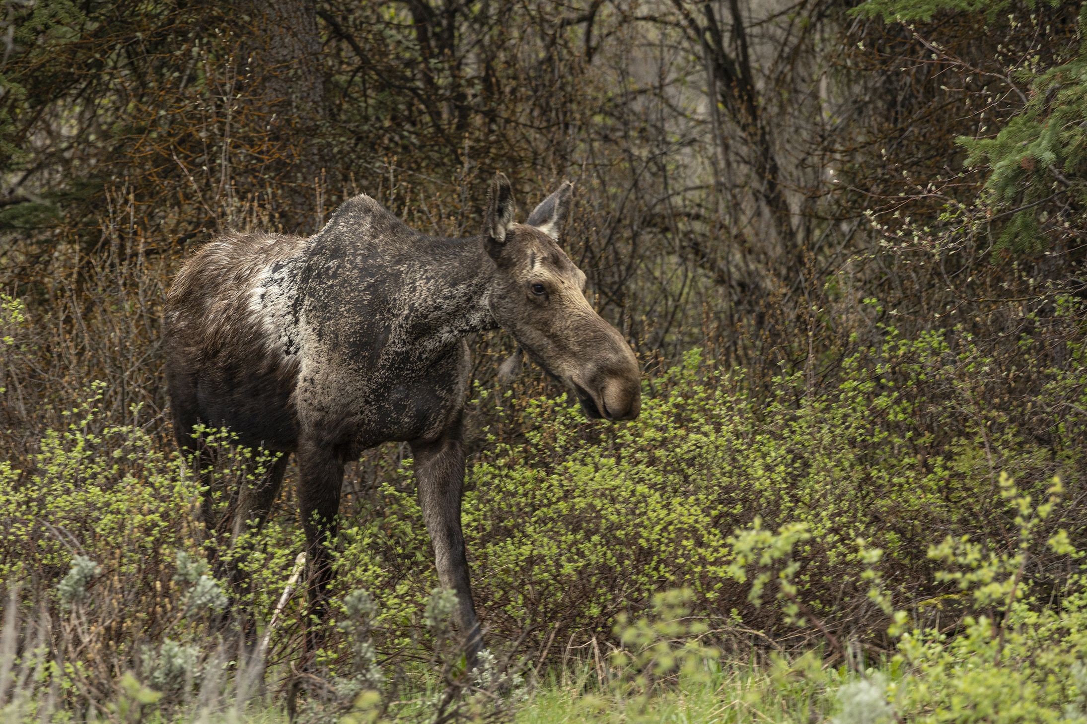 Drove out of the park to Cooke City for lunch and after about 5 minutes inside the park came across a female moose with her calf.